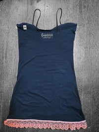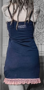 Lifted straight from the pages of The Haunted Mask, this one-of-a-kind dress is a Goosebumps relic reimagined in stitches and lace. Spaghetti straps slip over the shoulders, leading to a light candy blue and pink lace-trimmed bust, while the hem is finished with a longer, deeper shade of vintage pink lace — sugar and scare in equal measure. Just like the cursed mask, once you slip this dress on, you may never want to take it off… or maybe you can’t. Midnight chills and paperback thrills stitched into every thread.